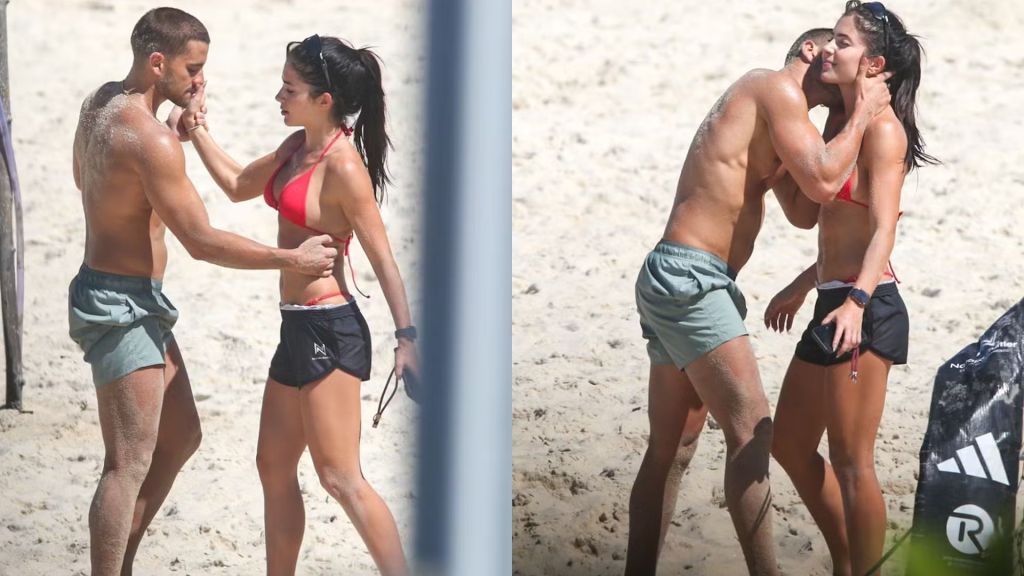Nos cliques, é possível ver a sintonia do casal durante uma partida de vôlei de praia. Em uma das pausas no jogo, o ator de “Elite”, da Netflix, chegou a dar um beijo no pescoço da amada. Nos outros registros, os artistas focam na disputa e esbanjam boa forma.