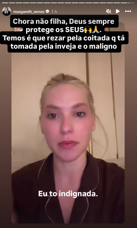 Durante a noite, Margareth compartilhou o vídeo da filha e a apoiou. “Chora não filha. Deus sempre protege os seus. Temos é que rezar pela coitada que está tomada pela inveja e o maligno”.